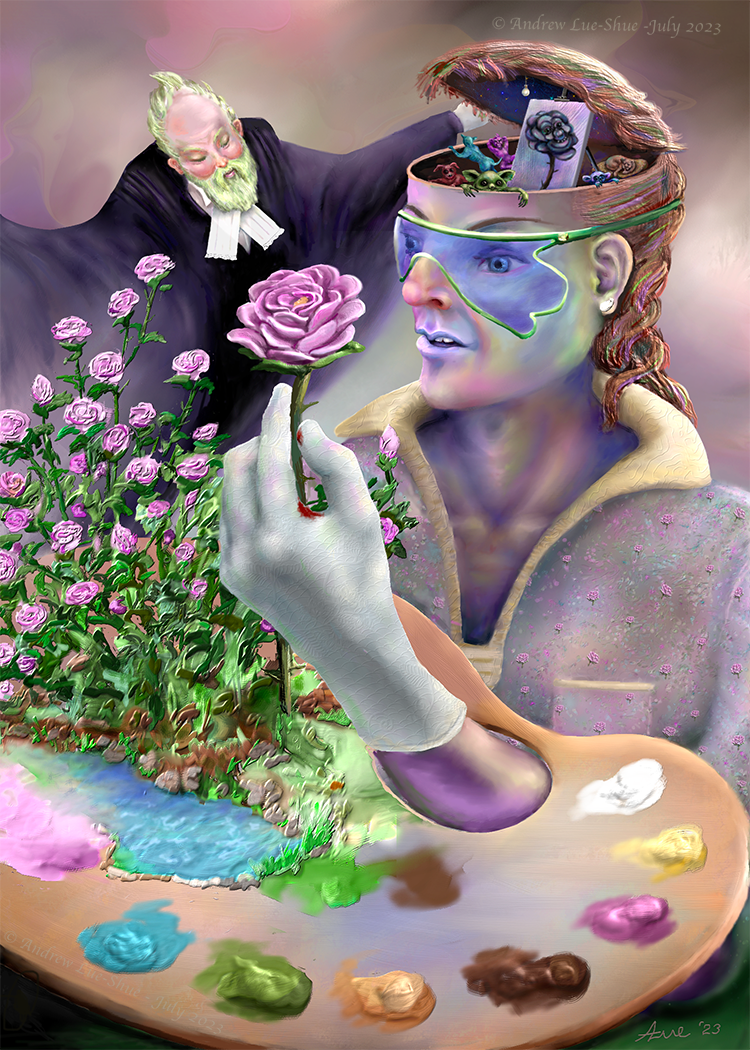 A Wild Rose Garden is a digital painting exploring subjectivity in the perception of reality. What we perceive is an illusion, and how we express it says more about us, our experiences, our beliefs, and our fears than it says about objective reality. Art is in itself subjective as it is a projection of the artist’s interpretation of reality, be it of the physical world, or of the psychological depths of the imagination.