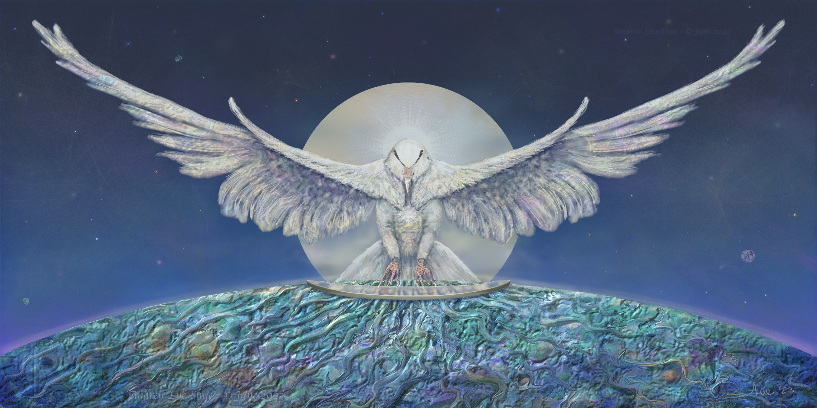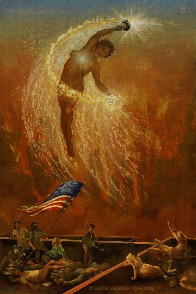 Phoenix’s Rising – Christina’s Woken: In a hypothetical near future, Chaos may seem victorious after defeating Liberty, the allegorical goddess-figure immortalized in Eugene Delacroix’s famous romantic era painting, Liberty Guiding the People, which represented the political upheavals in France during the early 1800s. Here the political upheaval is projected onto the American continent, where ironically, the Statue of Liberty, a gift of the French Republic, stands guard over all of Western Democracy. The potential death and destruction in any eventual civil conflict today are accentuated by some morbid images taken from Théodore Géricault’s The Raft of the Medusa. Another icon, taken from an American artist, Andrew Wyeth’s Christina’s World, symbolic of a traditional American ruralism, reinforces the resilience of the democratic spirit. With Liberty imaginably defeated in the flames of destruction of America’s great metropolis, she spectacularly reincarnates as Phoenix, rising out of the ashes, and bringing hope through light. Phoenix, with her gift to us of a large white lotus flower, symbolic of her wisdom and resilience, represents a not-so-new American ideal, and perhaps, a new democratic world order. She offers testimony and hope to American indigenous peoples, African-American descendants of enslaved people, all immigrants and refugees to America, then and now, from lands across the globe. She shows that perseverance in holding on to one’s dream, commitment to integrity, and sacrifice of immediate and superficial pleasures often follow a long and winding road to self-realization. Like the lotus flower that blossoms out of the mud, those that finally arrive home, understand that the route to get there was the real prize.