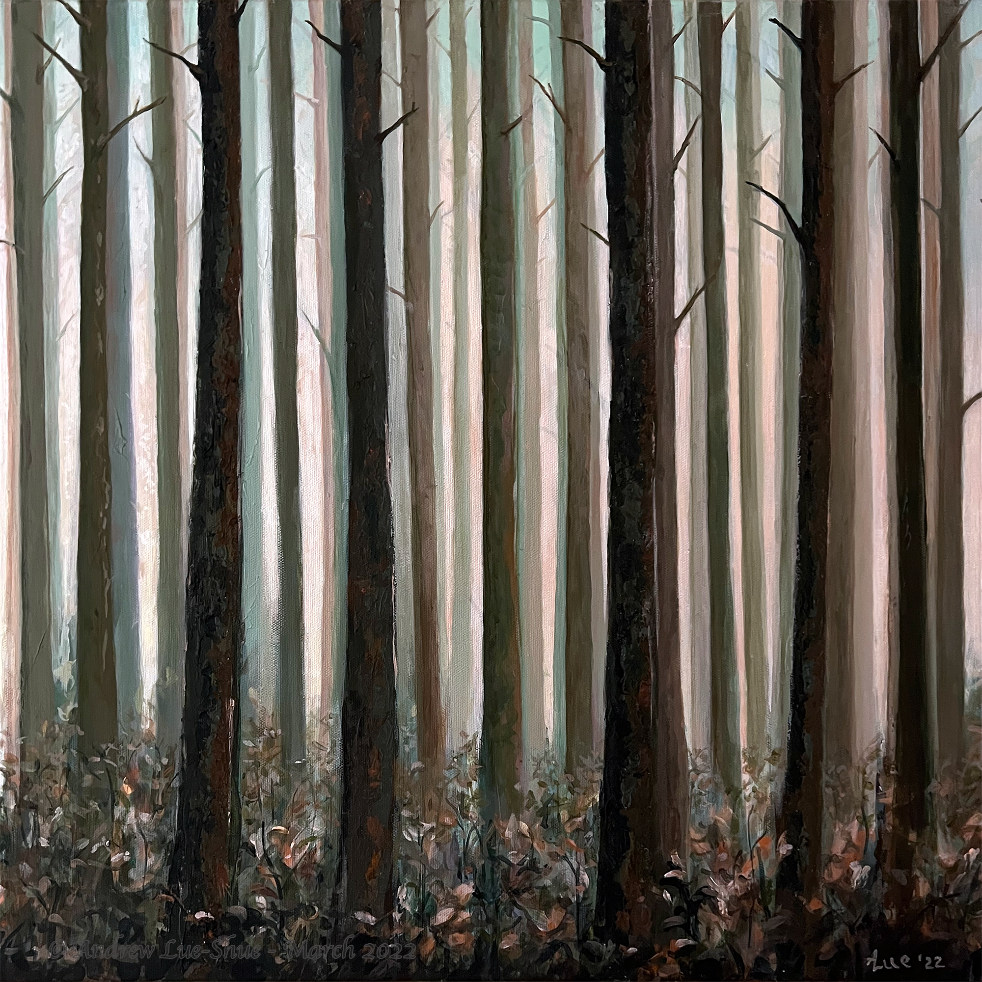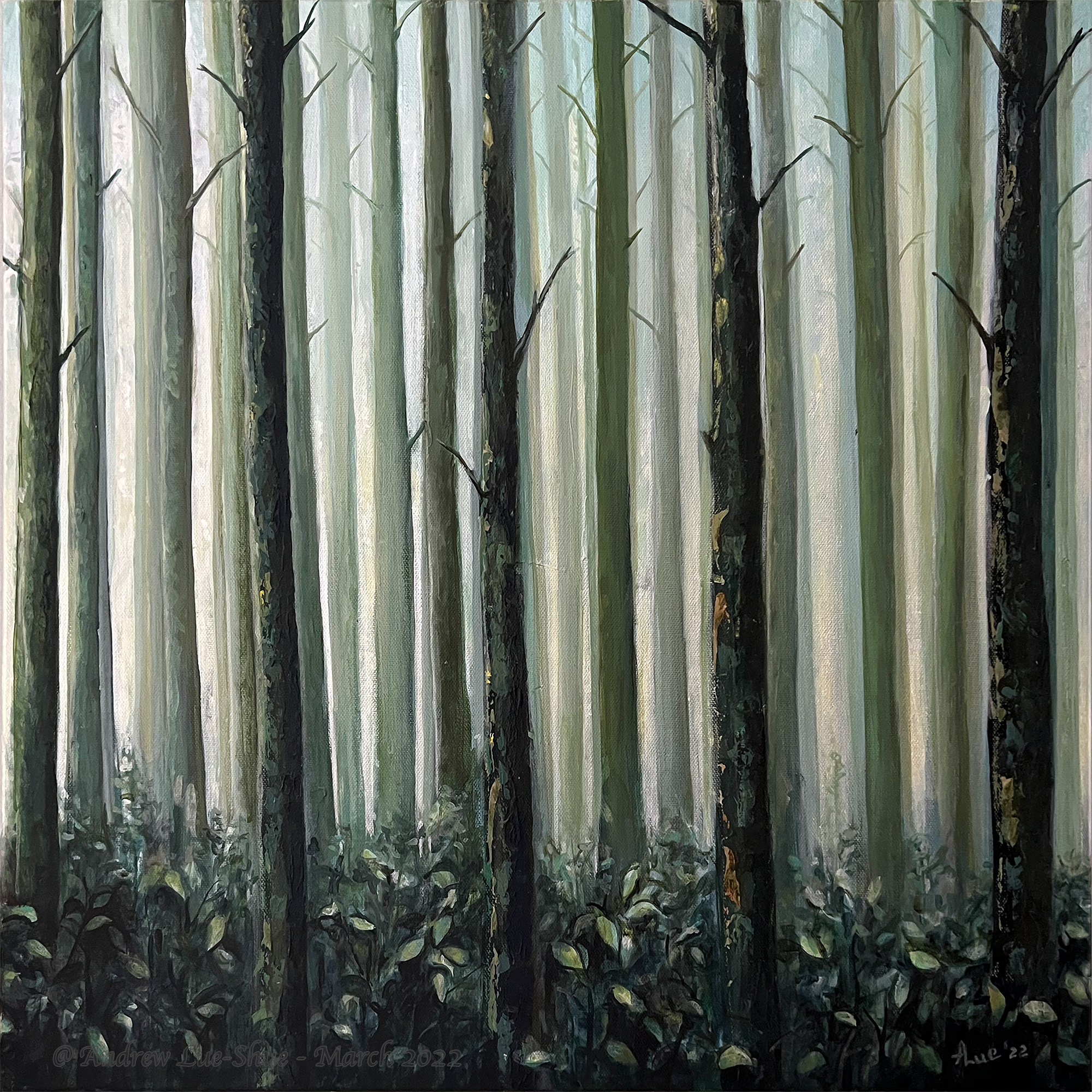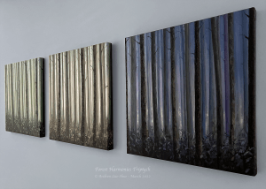 The triptych, Forest Harmonies, represents a lyricism in the language of forests in three movements, and in the secondary colours of green, orange and purple from luminosity to darkness. Thus, it is a harmony within the whole colour spectrum. By extension, the triptych is about the spirit of collaboration and the intrinsic harmony in life. Sunrise, as a green youthful phase, is already a harmony with two primary colours, yellow and blue, with tinges of red in its greys. Sunset is the still vibrant midlife phase harmonized with red and yellow, with hints of blue in its greys. Midnight is the last phase of life harmonized with blue and red, with a lueur of yellow in its light. Not only are the individual trees not separated from the forest, they sing a harmonious melody as a choir; their whole life cycle is also in harmony.